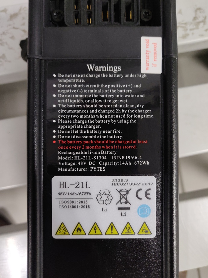 Caractéristiques : Batterie rechargeable Li-ion Model : HL-21L-S1304 13INR19/66-4 Voltage 48V DC Capacity : 14Ah 672Wh Manufacturer : PYTES