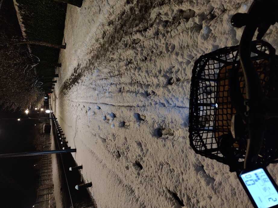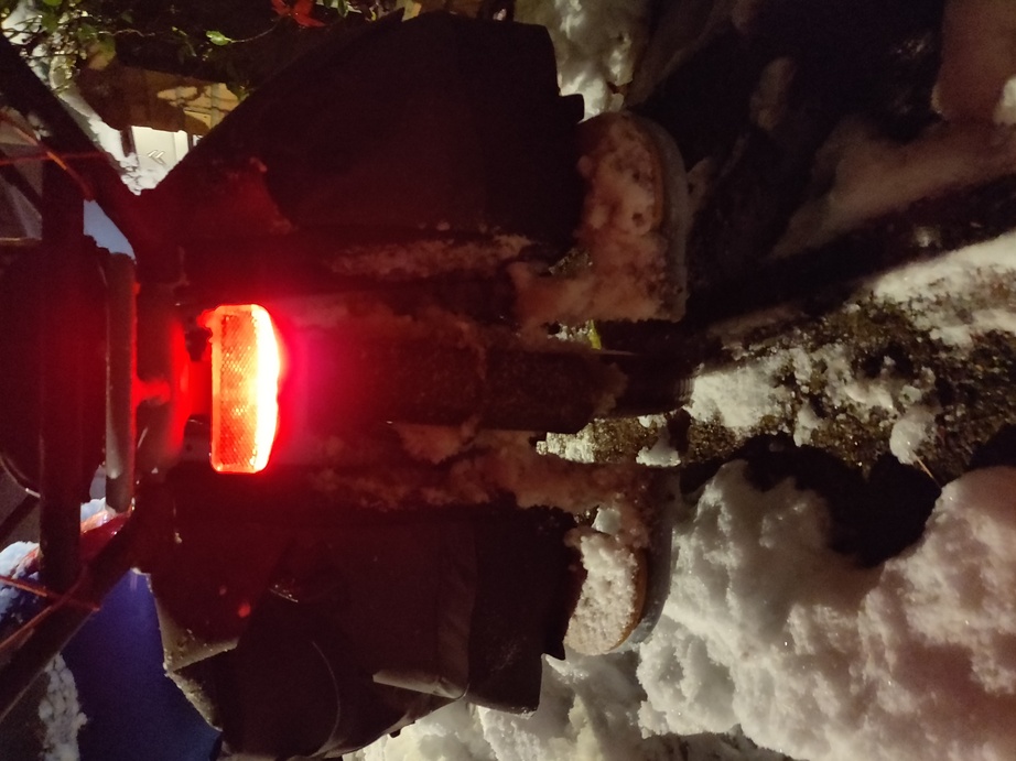 J'ai roulé de nuit, sur les des chemins de terre et sur des routes qui n'avaient pas été déneigées. Le spectacle est magnifique, la sensation de conduite surprenante. Le vélo est toujours équipé de ses pneus d'origine, des pneu chinois qui se comportent très bien selon moi. Les seules fois où j'ai glissé j'ai perdu l'adhérence sous la route avant, soit sur de la mousse soit sur une plaque d'acier. Pour ce qui est de la neige, je n'ai pas eu de problème. Cependant j'étais très attentif dans les courbes pour limiter la vitesse ainsi que l'inclinaison, afin de ne prendre aucun risque.