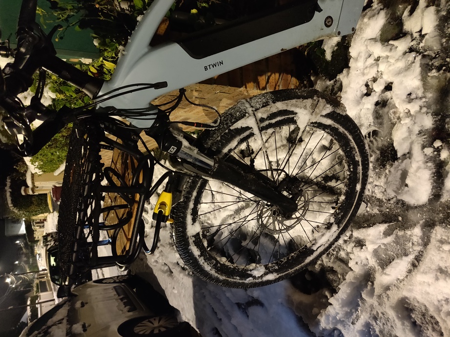 Entre la peur de glisser, les aspects techniques et le froid, rouler dans la neige avec le cargo Decathlon n'est pas de tout repos, mais c'est possible ! Retour sur quelques aspects lié à l'accumulation de la neige sur le vélo.